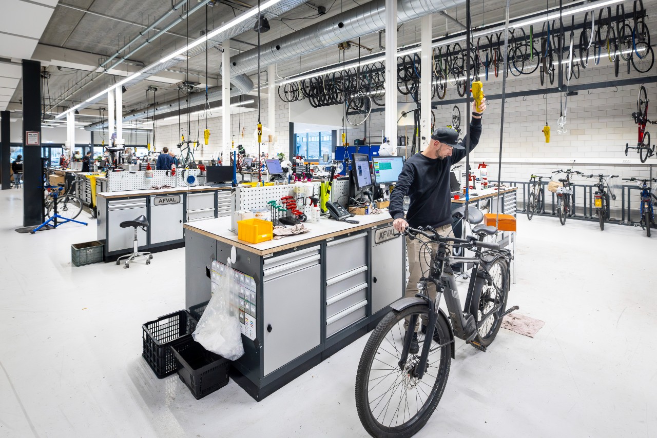 Joop van Voorthuizen Fietsen, die in 2021 verhuisde naar een nieuw pand met een oppervlak van 2.200 vierkante meter, heeft zich door Shimano laten inspireren voor een moderne en zo efficiënt mogelijke werkplaats. “We werken met eilanden en de fiets hangt altijd met de kettingkastzijde naar de werkbank voor korte loopafstanden en dus meer efficiëntie.”