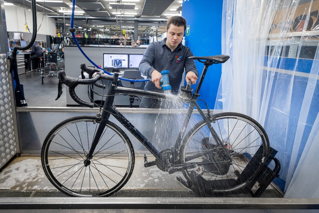 De werkplaats is van alle gemakken voorzien en heeft bijvoorbeeld een wascabine waarin zo’n beetje elke fiets past. “Die wassen we met warm water en shampoo en drogen we met een blower. We hebben er ook een apart hok met afzuiging waar je onder meer kunt lassen, persen, schuren, spuiten en ultrasoon reinigen. Haast te veel om op te noemen.”